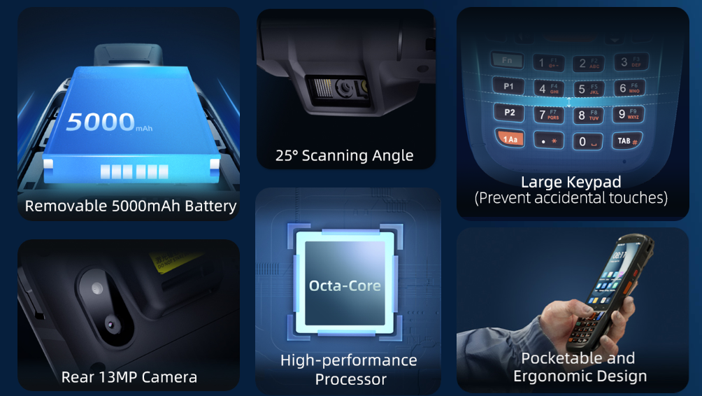 Pin dung lượng cao 5000mAh cung cấp đủ năng lượng để đáp ứng nhu cầu làm việc cả ca. Với pin rời tiện lợi, bạn có thể dễ dàng thay pin để sạc mà không lo gián đoạn việc sử dụng thiết bị.